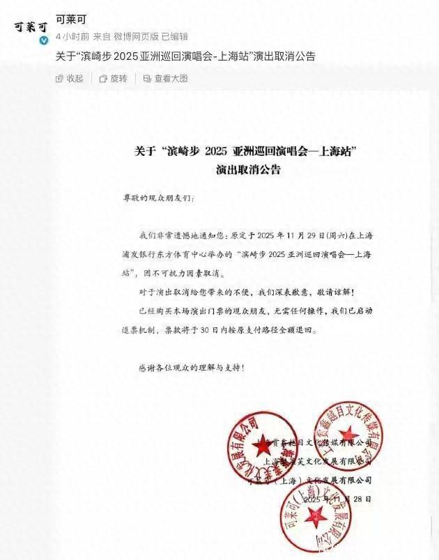 11月28日,一则公告击碎了无数粉丝的期待——原定于29日开演的“滨崎步2025亚洲巡回演唱会上海站”正式官宣取消,主办方同步启动全额退票机制,上海文旅官方平台第一时间转发确认。这场备受瞩目的文化盛宴骤然落幕,并非孤立个案:近期JO1广州粉丝见面会、上海国际喜剧节“吉本喜剧专场”等20余场日本艺人在华演出接连取消或延期,《蜡笔小新:炽热的春日部舞者们》等多部日本影片也宣布暂缓在华上映。中日文化交流的骤然降温,背后是日本首相高市早苗涉台错误言论引发的连锁反应,更鲜明彰显了“核心利益不容触碰”的铁律,任何挑战这一底线的行为,终将付出交流中断的沉重代价。